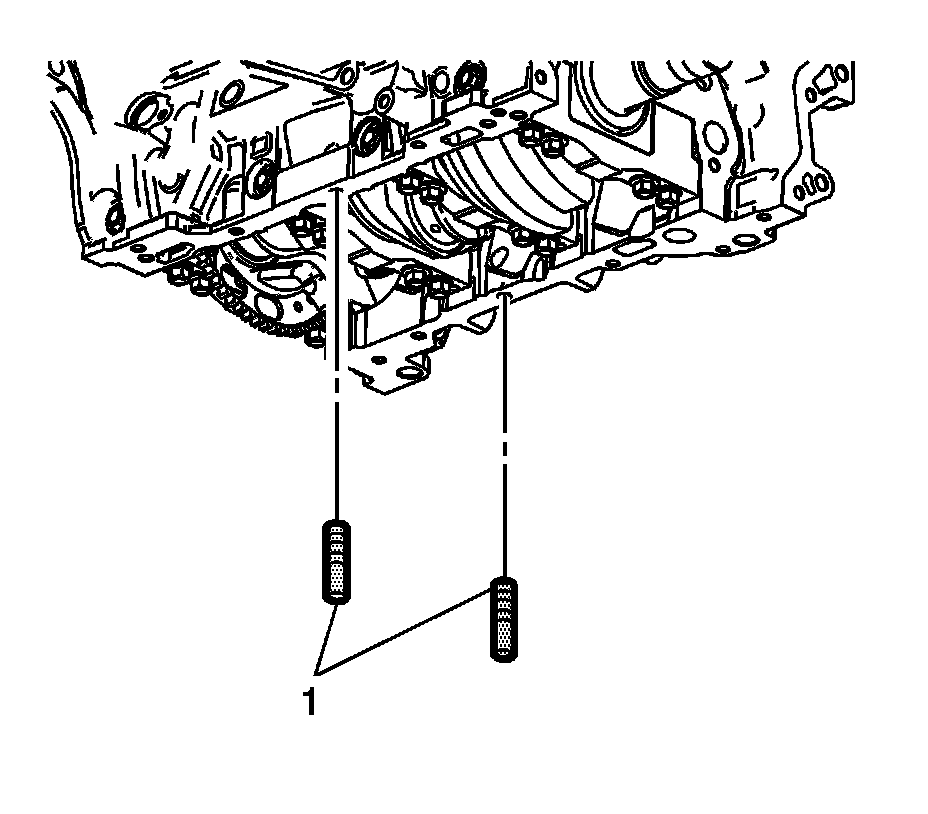 2. Install the 8 mm (0.315 in) guides (1) from the EN-46109 - set into the center oil pan rail bolt hole on each side of the engine block.