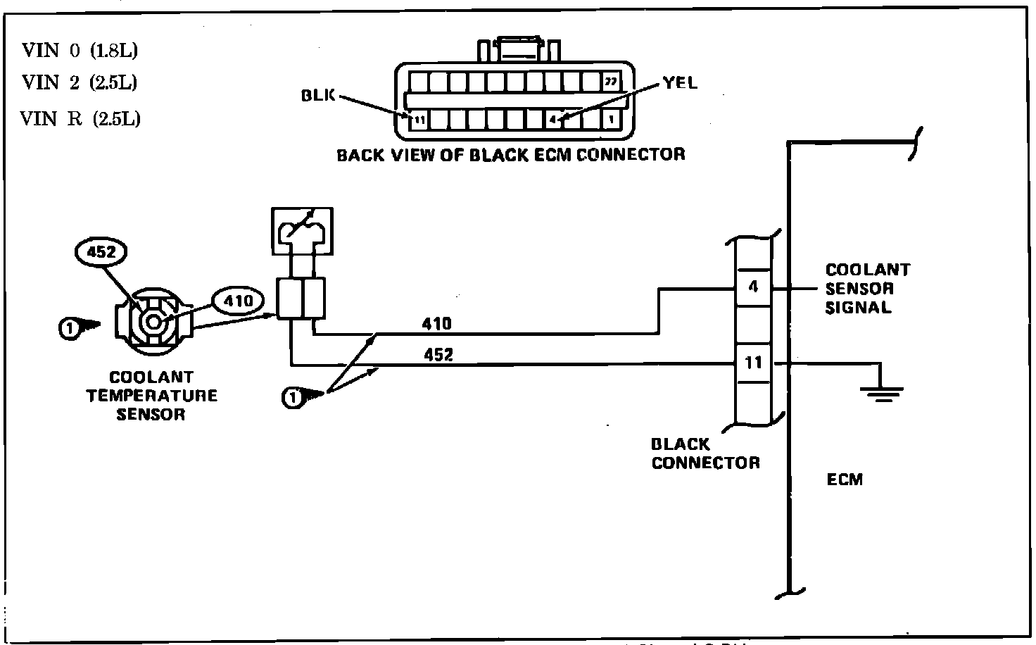 2. If checking resistance at the coolant sensor is difficult because of sensor location, disconnect the black ECM connector and check resistance between harness connector terminals 4 and 11.