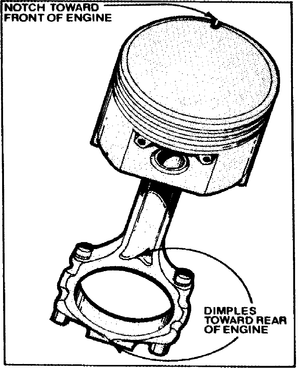 Assemble pistons and rods as indicated in Fig. 12. The notch cast in the piston heads must face the front of the engine when the piston and connecting rod assemblies are installed. Correct piston and connecting rod assembly installation is extremely important as incorrect installation could cause an engine knock. Upon installation, measure the connecting rod side clearance using a suitable feeler gauge. Measurement obtained should be .006---.022 inch.