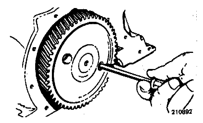 9. Remove the two camshaft thrust plate screws by working through holes in the camshaft gear.