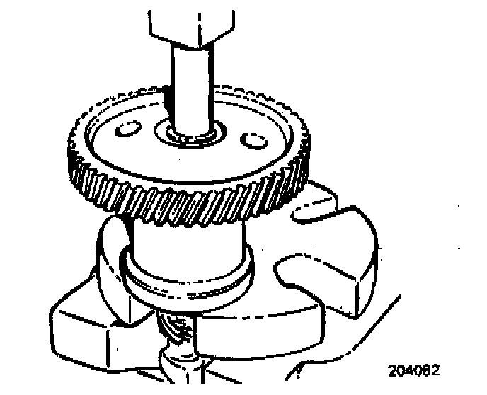 2. Place tools on table of a press. Place the camshaft through the opening in the tools. Press shaft out of gear using socket or other suitable tool. Thrust plate must be so positioned that woodruff key in shaft does not damage it when the shaft is pressed out of gear.