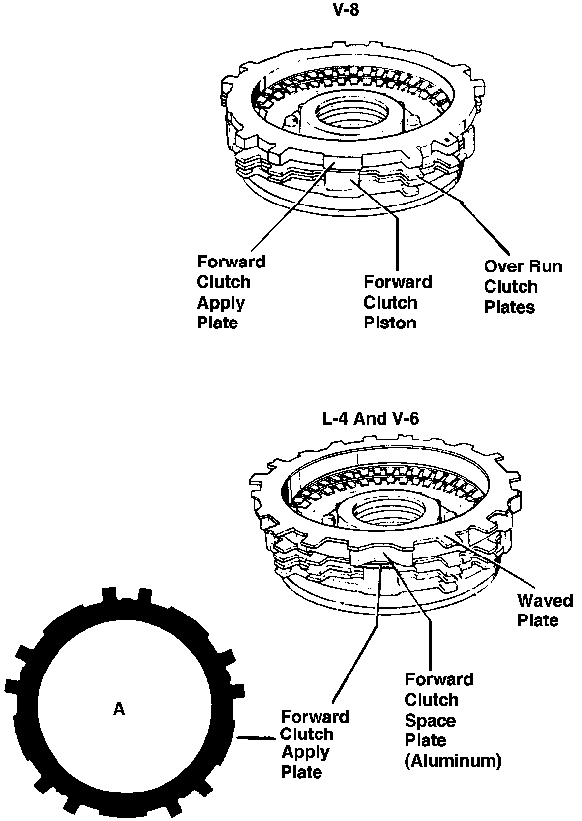 The top overrunning clutch steel disc in 4 and 6 cylinder models does not fit inside the fingers of the forward clutch piston. It is actually the forward clutch apply plate, (figure A).