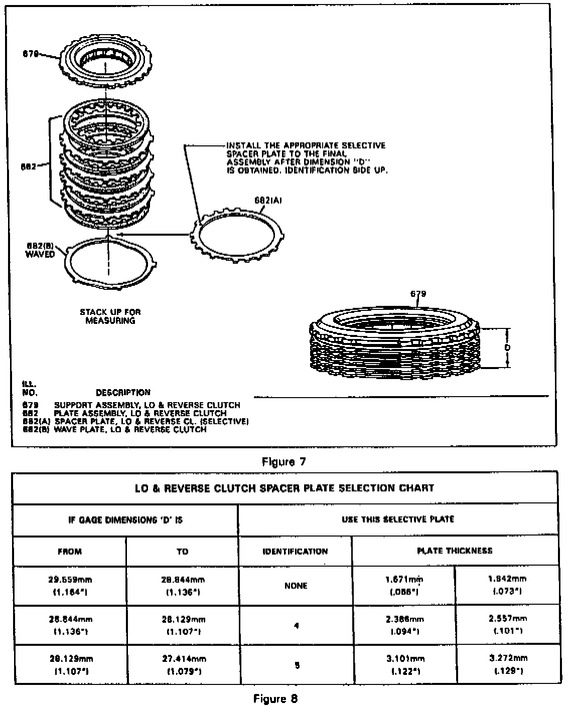 3. Measure height of clutch pack from work surface to the top of lo and reverse clutch support (679). Refer to Figure 7, Dimension "D".
