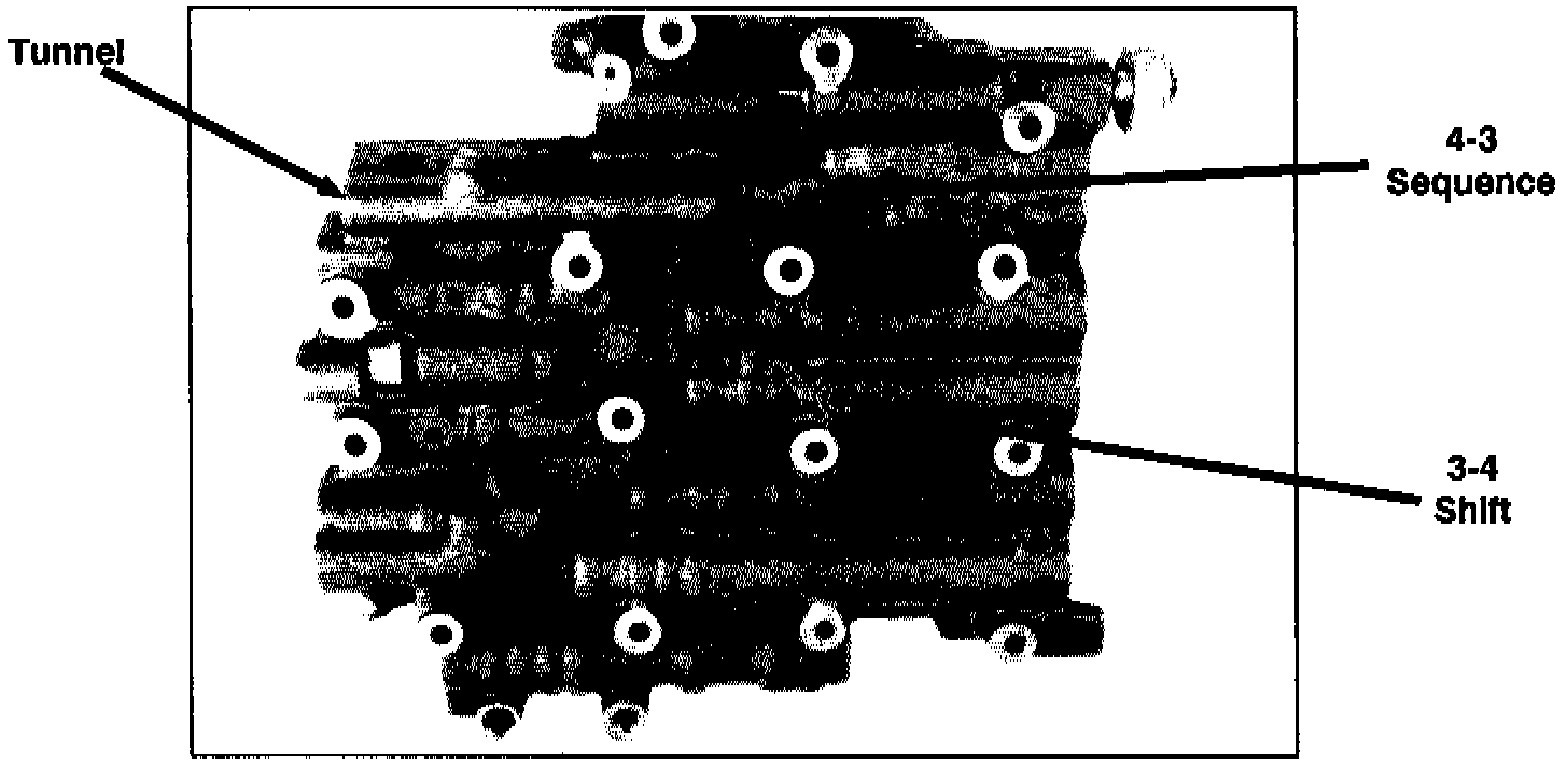 F. Air check into the exhaust hole at the 3-4 shift valve (This will check the 4th gear switch, the 4-3 relay and sequence valves for stickiness, and check for a missing plug at the relay valve).