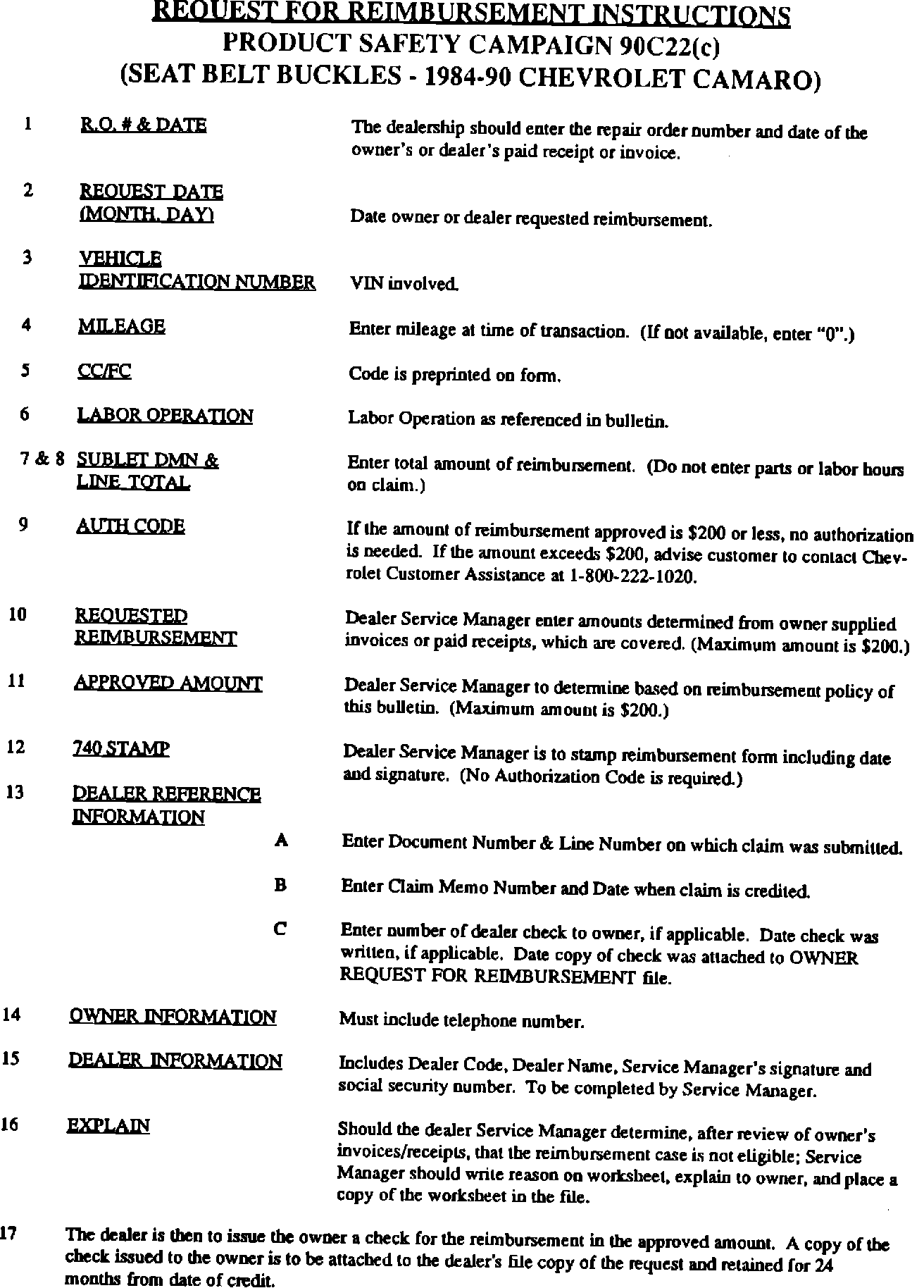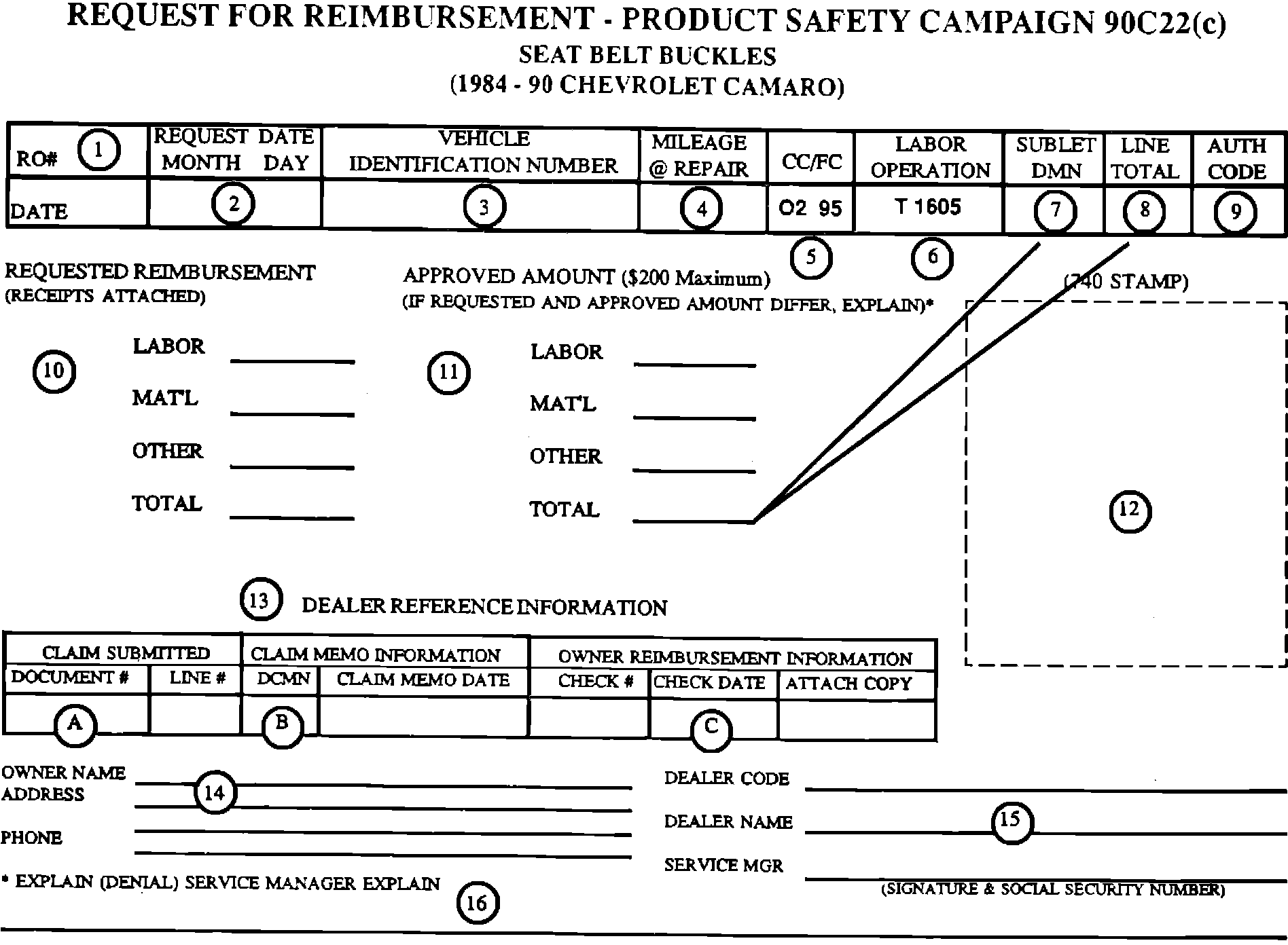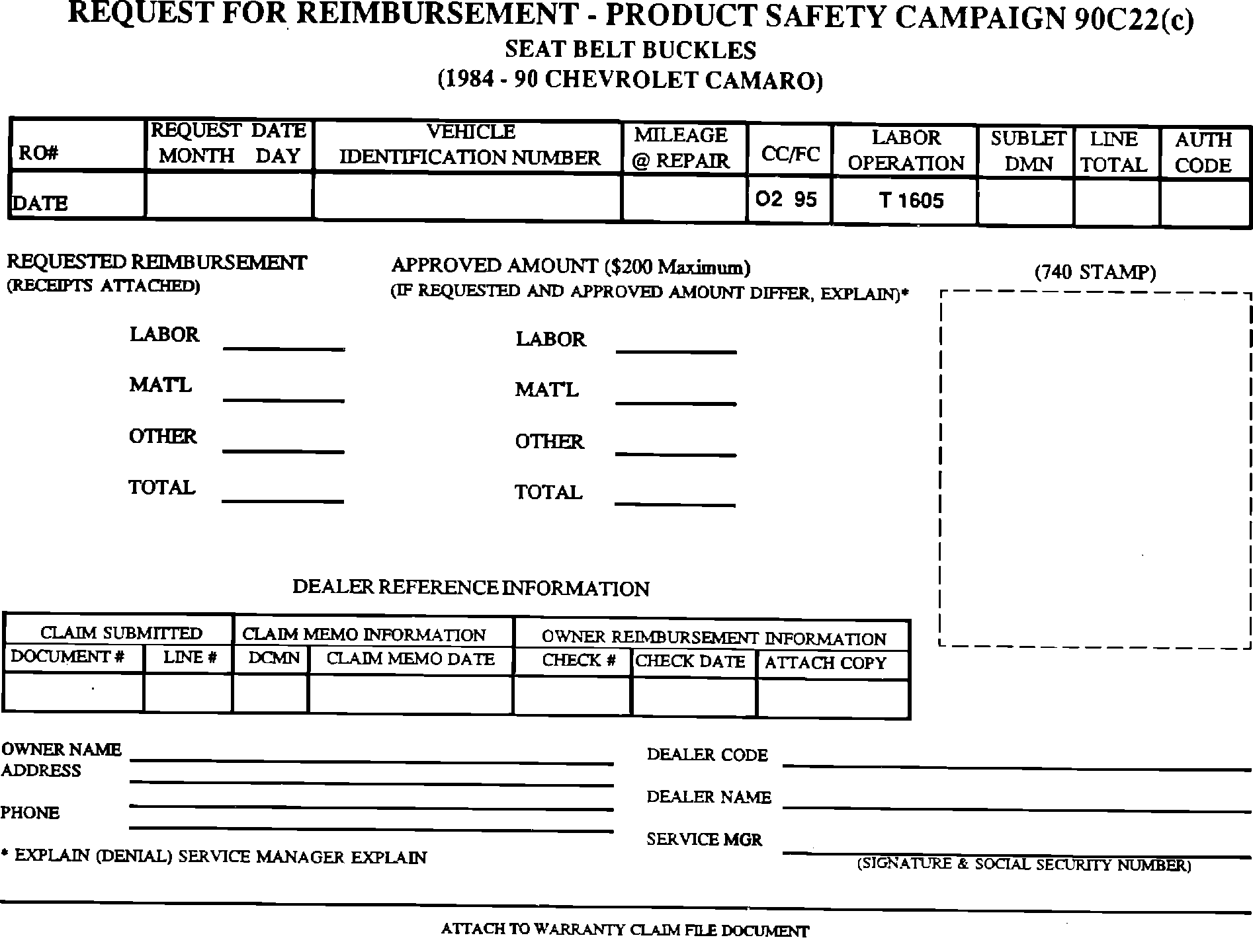 Customer requests for reimbursement of prior repair to correct a previous seat belt buckle condition are to be submitted according to the instructions in this bulletin using the "Request For Reimbursement" form. Additional copies of the form are to be reproduced by the dealer.