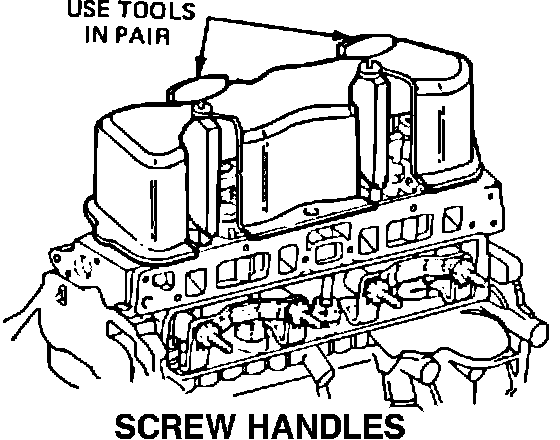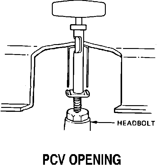 To use these tools, remove the PCV hoses and grommets from the rocker arm cover and insert a tool into a PCV opening as shown in the illustration. Turn the tool 90 degrees to place the lips under the bottom of the baffle, then slide the tool to the right side, or rear of the engine, placing the end of the screw over a cylinder head bolt. Turn the screw handle to extend the screw from the tool until snug. Repeat this procedure with the second tool. Turn both screw handles simultaneously until the cover breaks loose.