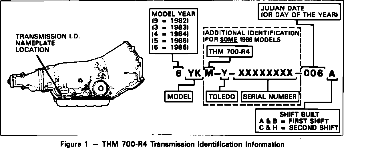 To service a 1984 (after Julian date 180) through 1986 (Julian date 006) THM 700-R4 transmission, use a new Pump body assembly, part number 8649950. The new pump body has a stepped bore incorporated to assist in retention of the pump body bushing. It also is supplied with a new seal, part number 8648394 and a Helix seal retainer, part number 8654491 for improved sealing. The seal and retainer are available separately.