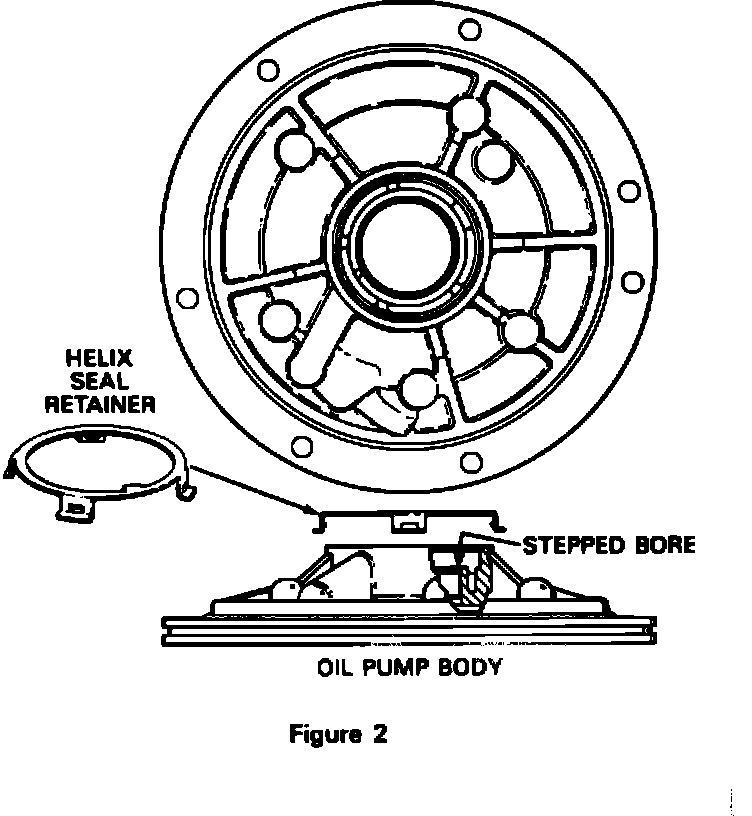 Fluid leaks from the oil pump body seal may be created by movement of the pump body bushing. If this condition is experienced, a new oil pump body should be installed.