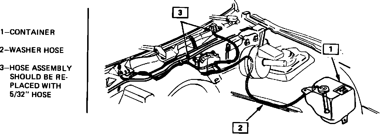To correct this condition, the washer hoses must be rerouted to provide an anti-drainback loop. This is accomplished by routing the washer hose under the accelerator cable, over and rearward of the brake booster, down to the side rail and forward to the solvent container (see illustration).