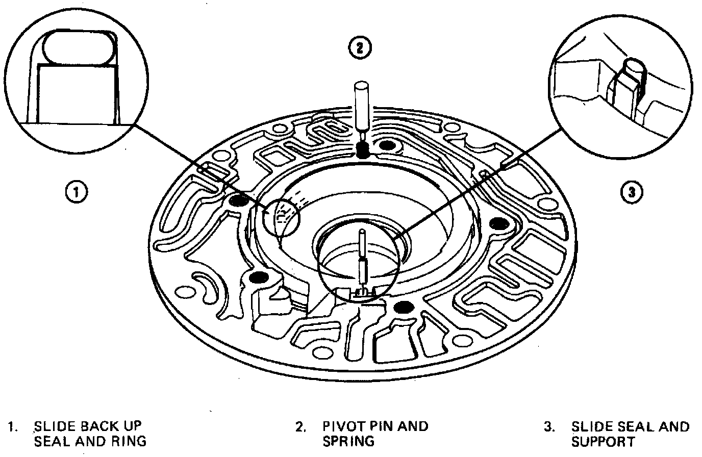 3. Install slide while aligning notch in slide with pivot pin, then the slide seal and support. Oil seal ring should face downward into the pump pocket.