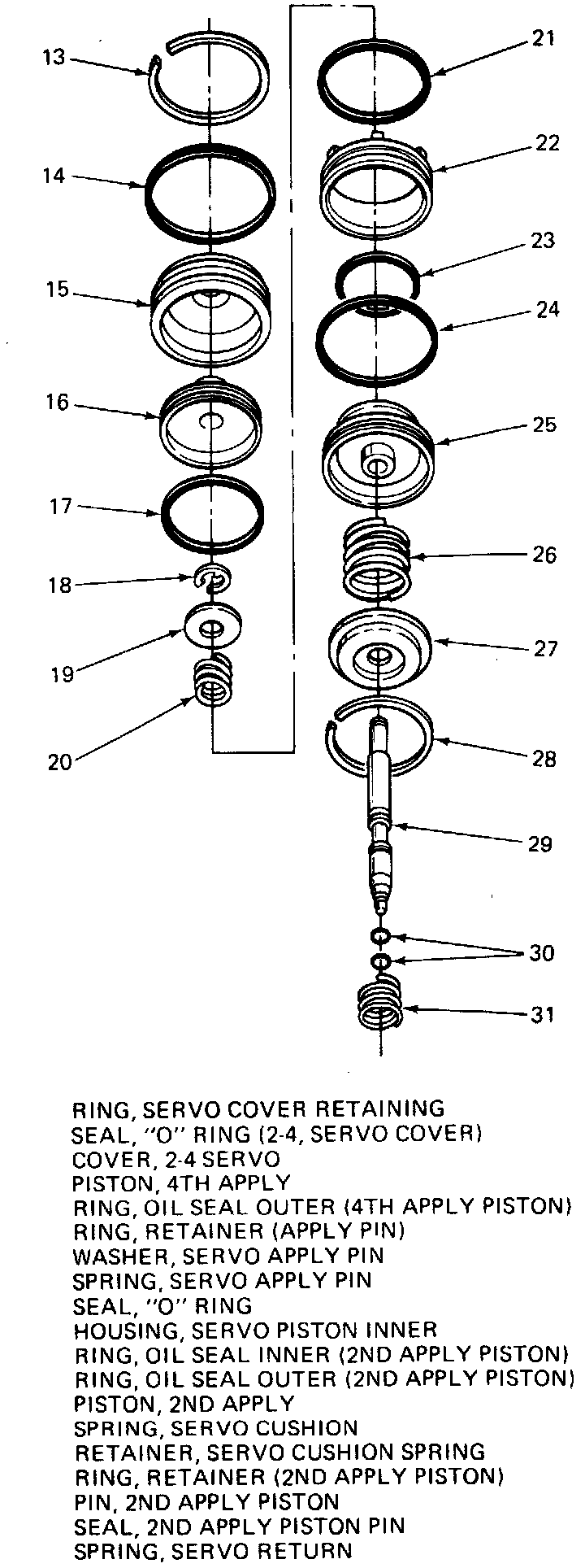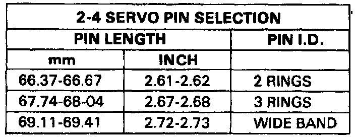 NOTE: Changes to the second servo apply pin eliminates the need for the two ring seals used. This change eliminates the potential for seal damage during assembly. Beginning January 5, 1987 (Julian date 05) T M 700-R transmissions are built with a new servo apply pin. However, the new second servo apply piston pin can be used on all 1982-88 model transmissions. If the past design second servo apply pin is used, seal rings must be installed. Three different pin lengths are used 2.61-2.62 inch (part No. 8667571 with identification 2 rings), 2.67-2.68 inch (part No. 8667572 with identification 3 rings) and 2.72-2.73 inch (part No. 8667573 with identification wide band).1. Install band apply pin tool No. J-33037 with apply pin, then torque assembly to 100 inch lbs.