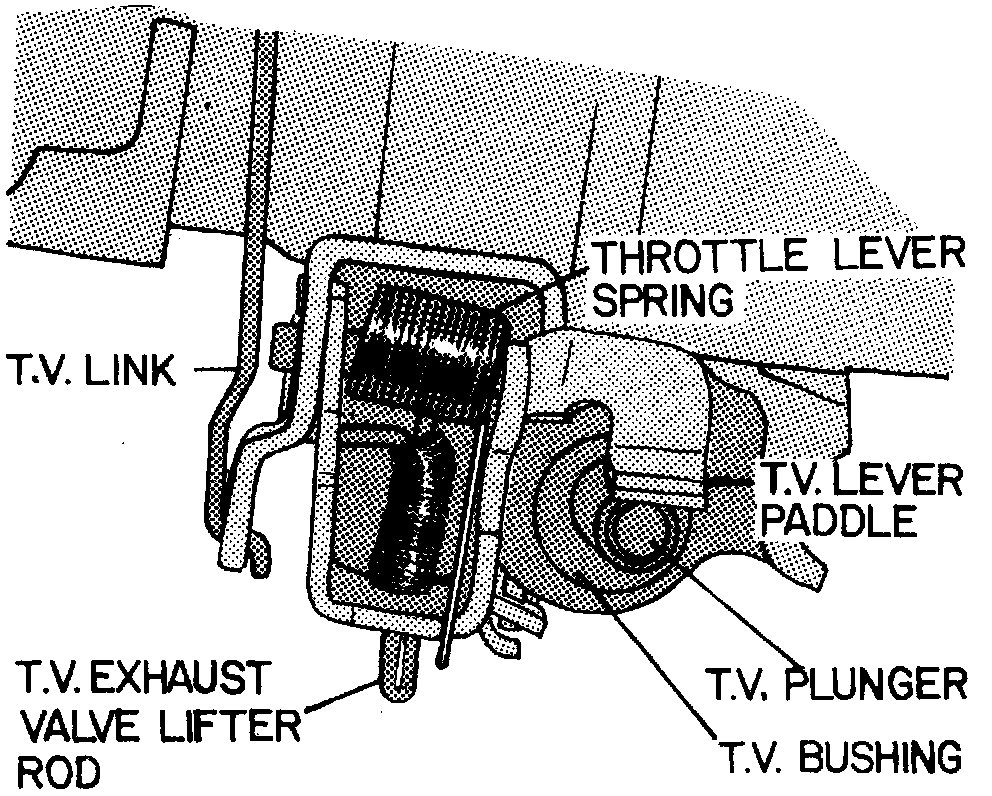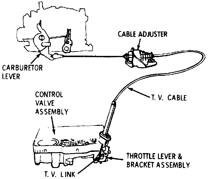 The T.V. cable should not be thought of as an automatic downshift cable. It controls line pressures, shift points, shift feel, part throttle downshifts7 and detent downshifts. The function of' the cable is similar to the combined functions of a vacuum modulator and detent downshift cable. The T.V. cable operates throttle lever and bracket assembly.