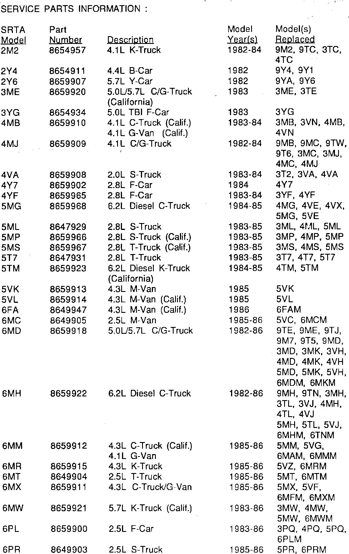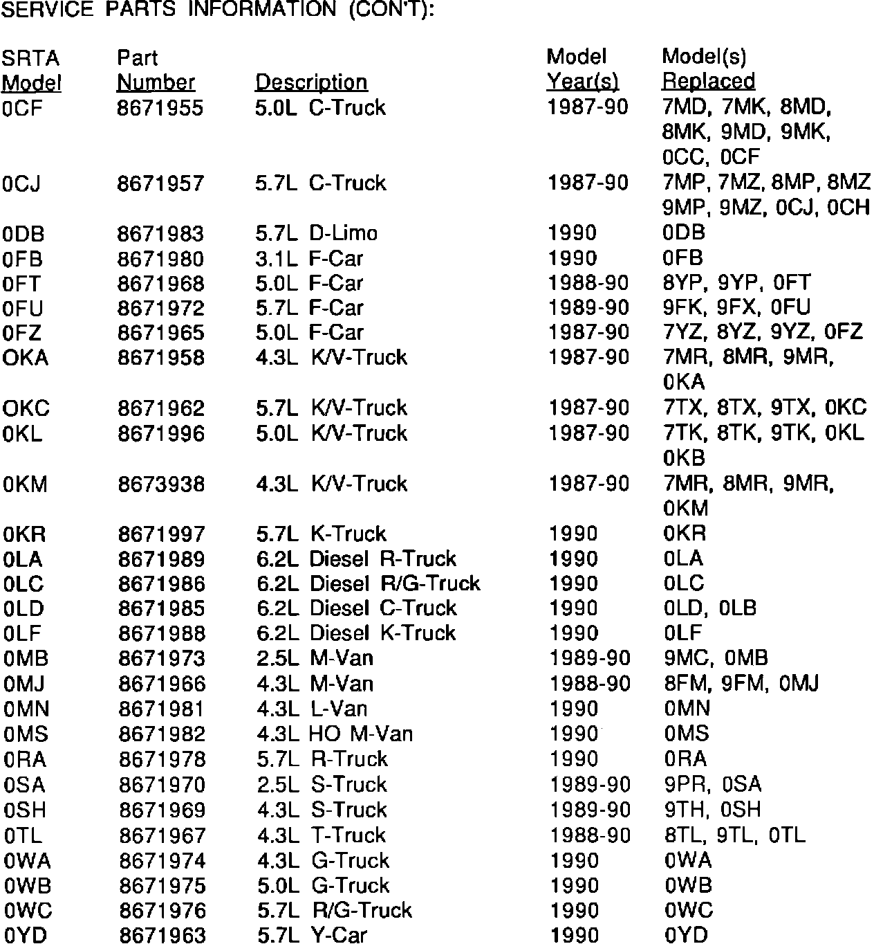 Model and Year: 1982-90 CAPRICE, CAMARO AND CORVETTE 1982-90 C1/C2, K1/K2, G1/G2, S1/S2 TRUCK 1987-90 R1/R2, V1/V2 TRUCK 1985-90 M1, 1990 L1 TRUCK