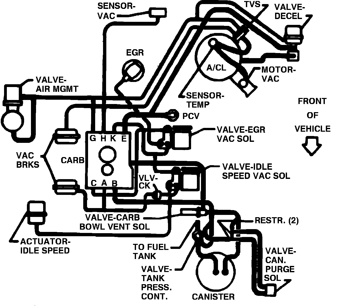Fig. 12 Vacuum Hose Routing. 1984 V6-173 (2.8L) 2 Bbl. Camaro & Firebird, (VIN 1 & L):