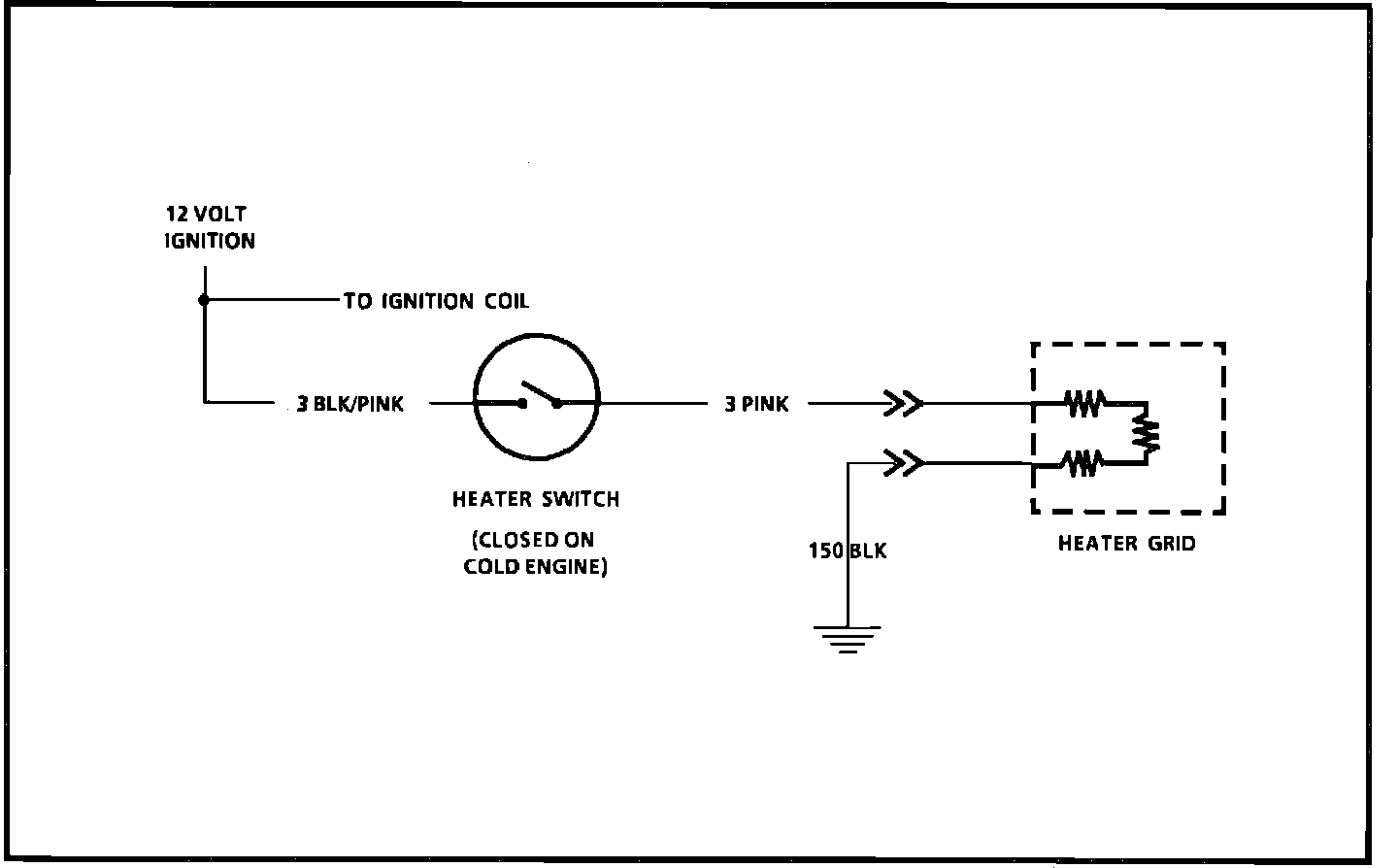 When engine is cold the heater switch is closed allowing current to flow to grid with ignition on. The grid is located under the carburetor and is used to help vaporize the fuel on a cold engine. When the heater switch reaches its calibrated valve the switch opens and the circuit opens.