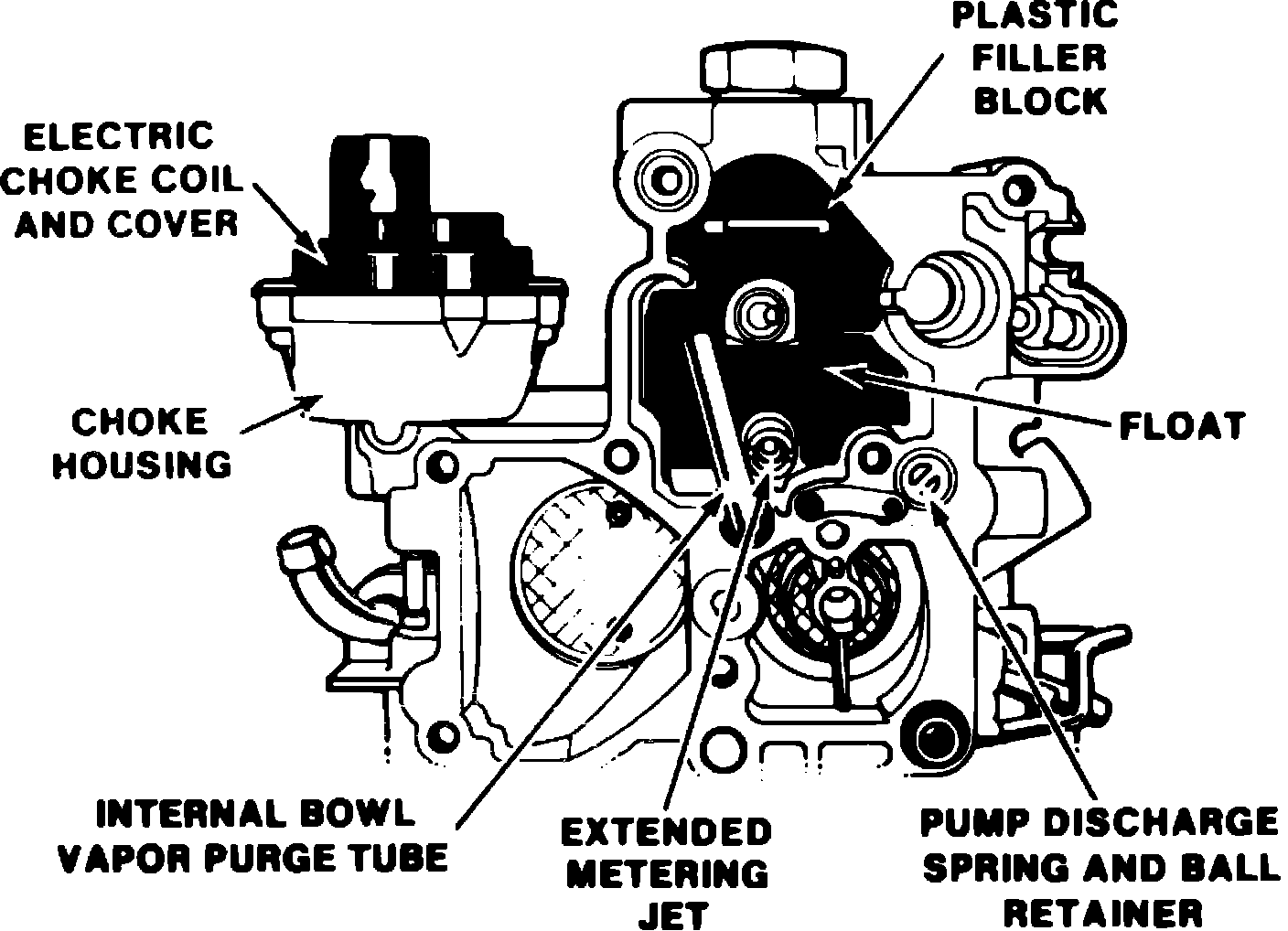 25. Using a small slide hammer or equivalent, remove plastic retainer holding pump discharge spring and check ball in place. Discard plastic retainer. Turn float bowl over and catch discharge spring and check ball. Do not attempt to remove the plastic retainer by prying out with a screwdriver or similar tool. This will damage the sealing beads on the bowl casting surface and will require float bowl replacement.