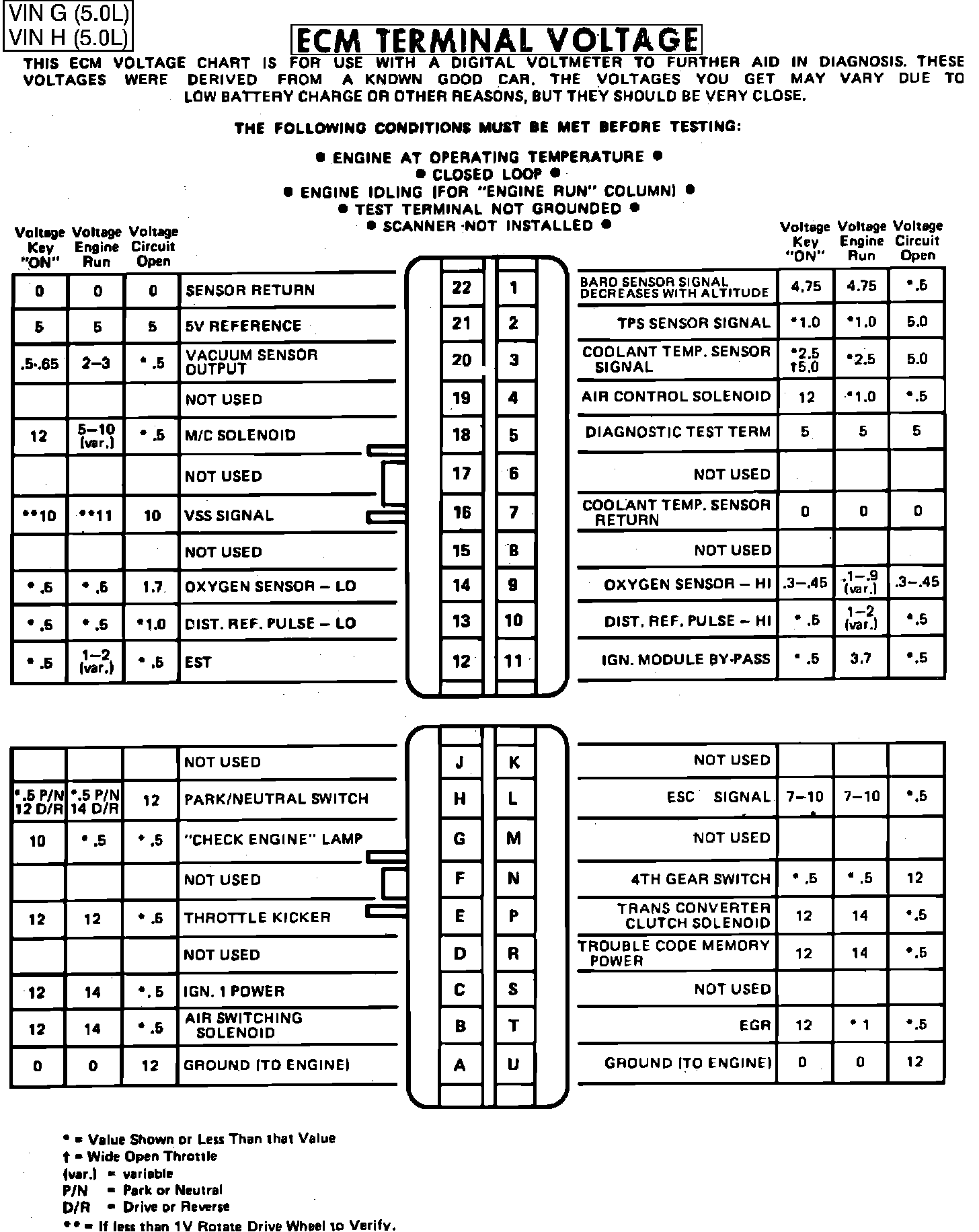 Fig. 024 - ECM Connector Terminal Identification & Voltage Specifications.: