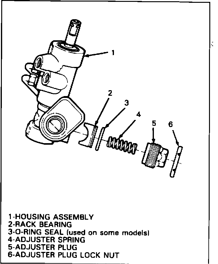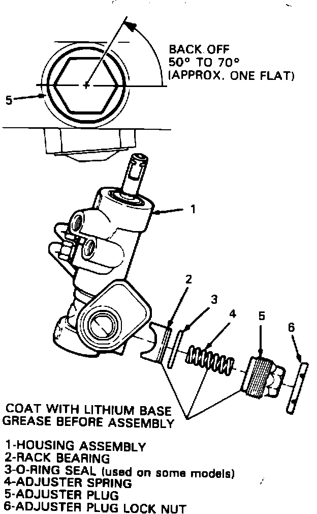 With rack centered in the housing, turn adjuster plug clockwise until it bottoms in the housing, then back off 50~ to 70~ (approx. one flat). Check torque on pinion. Maximum pinion preload torque is 1.8 N-m (16 In.Lbs.).