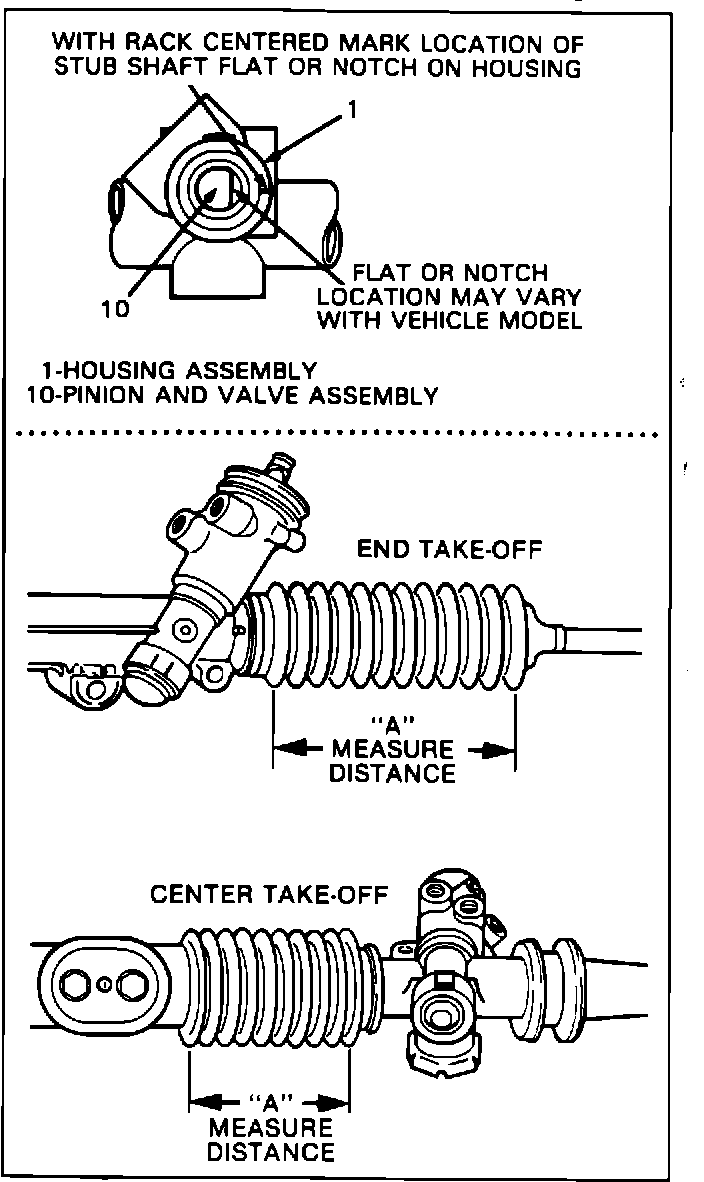 When pinion and valve assembly is fully seated, flat or notch in stub shaft and mark on housing must line up while the rack is centered in the housing. Refer to measurement "A" to verify proper rack position. (See Figure 3.)
