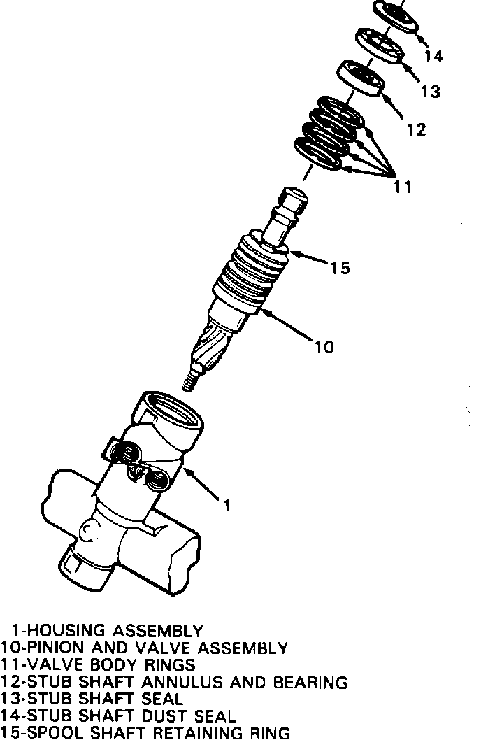 10. Remove stub shaft dust seal, stub shaft seal, stub shaft bearing annulus assembly, pinion and valve assembly, with spool shaft retaining ring, and valve body rings attached.
