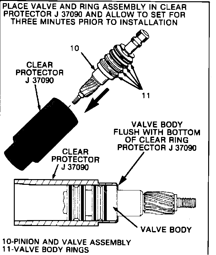 2. Place pinion and valve assembly into clear pinion and valve assembly ring protector J 37090. (Be sure to use only the clear protector.) Allow to set for approximately three minutes while continuing installation preparation. This allows the valve rings to be properly sized.
