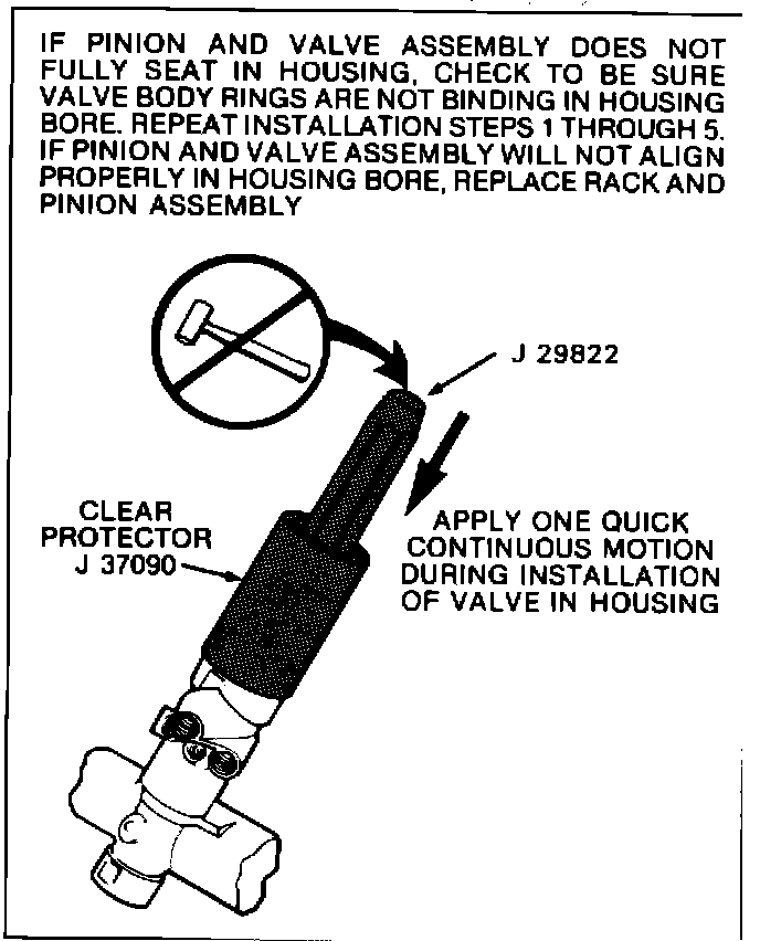 Set pinion and valve assembly onto housing using J 37090. Use J 29822 pinion seal installer to push assembly into housing bore. DO NOT hammer or use excessive force. If pinion and valve assembly does not fully seat in housing, check to be sure valve body rings are not binding in housing bore. Check rings for cuts or damage. Repeat installation steps I through 5. If pinion and valve assembly will not align properly in housing bore, replace rack and pinion assembly.