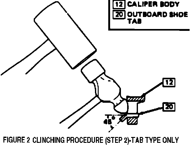 All models of the Citation, Celebrity, and Cavalier cars have had an outboard shoe that is held in position by clinching the tabs with a ball peen hammer. The object of the peening is to tightly attach the shoe to the caliper to dampen out vibrations in the pad that can cause a squeal. Tightening the pad by reclinching can have a positive effect on squeal. To reclinch the shoe: