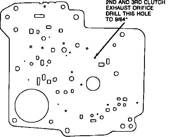 When servicing any 1984 thru early 1985 THM 200C transmission built before the above Julian Date, remove the valve body spacer plate. Drill the 2nd and 3rd clutch exhaust orifice out to 3.57 mm (9/64") (refer to Figure 1 below). Using a 6.3 mm (1/4") drill bit, hand chamfer both sides of the hole, slightly, to remove burrs and rough edges.