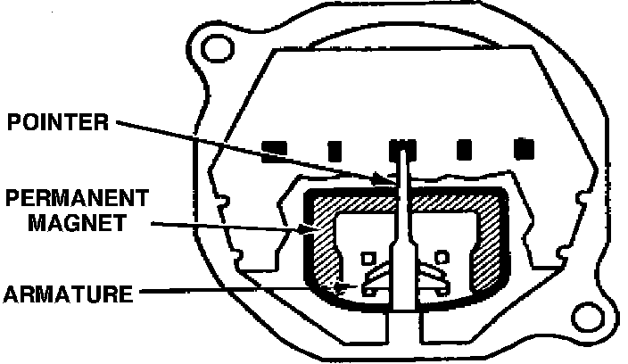 A conventional ammeter must be connected between the battery and alternator in order to indicate current flow. This type ammeter, Fig. 1, consists of a frame to which a permanent magnet is attached. The frame also supports an armature and pointer assembly. Current in this system flows from the alternator through the ammeter, then to the battery or from the battery through the ammeter into the vehicle electrical system, depending on vehicle operating conditions.