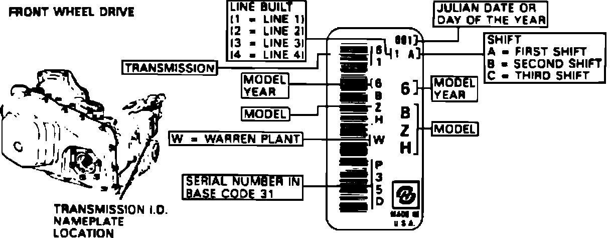 The transmission identification tag or stamped identification contains such information as transmission type, model year, model, serial number, and Julian date.