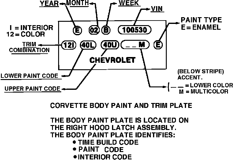 The body paint and trim plate which is stamped with the trim, paint and time built codes is attached to the left door hinge pillar.
