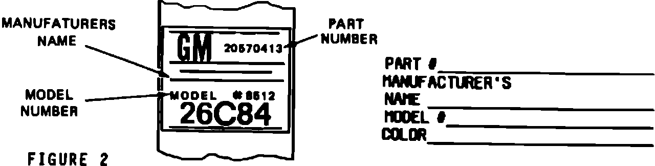 2. Part number, if shown, Manufacturer's Name and Model Number that appears on the label of the seat belt assembly along with the color of the webbing. Colored extenders for past model vehicles are furnished on an "as material available basis" only. If webbing of the color designated for a past model vehicle is not available, the extension will be furnished in black.