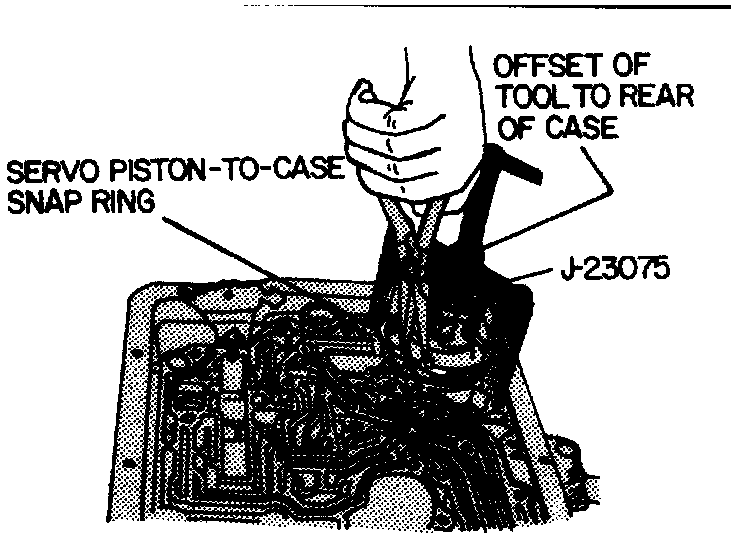 5. Using tool J-23075, compress servo piston and remove snap ring, see image. Loosen tool slowly to relieve servo spring tension. Remove burr from O.D. of piston bore, if necessary, to prevent damage to snap ring during installation.