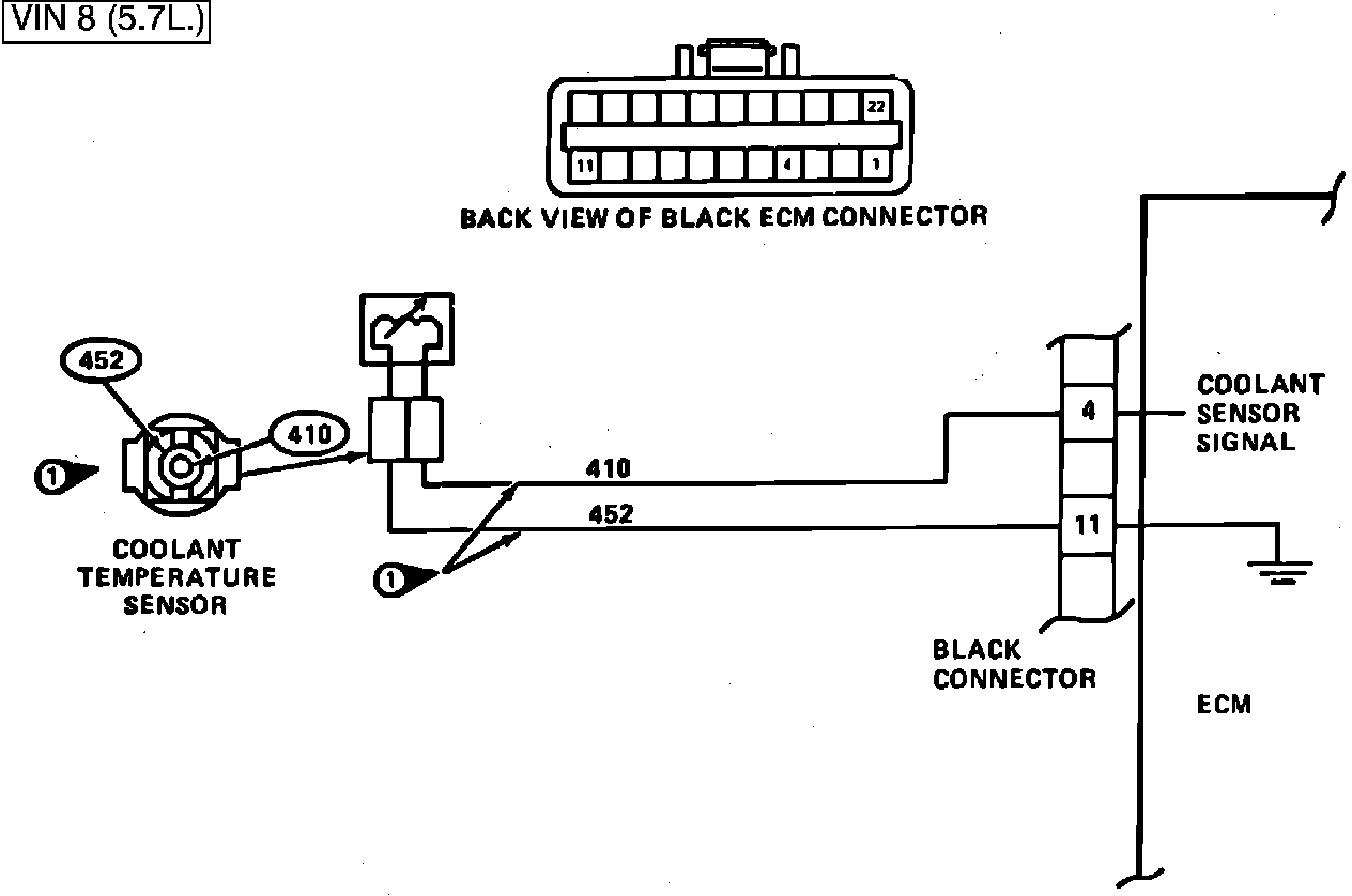The Coolant Temperature Sensor uses a thermistor to control the signal voltage to the ECM. The ECM applies a voltage on CKT 410 to the sensor. When the engine is cold the sensor (thermistor) resistance is high, therefore the ECM will see high signal voltage.