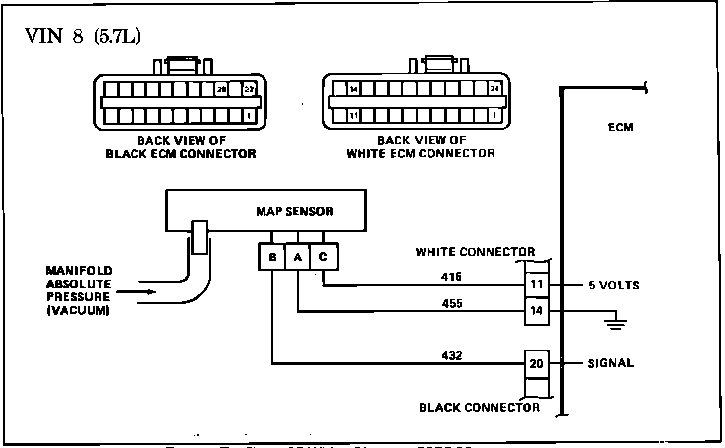The Manifold Absolute Pressure sensor (MAP) responds to changes in manifold pressure (vacuum). The ECM receives this information as a signal voltage that will vary from about 1 to 1-1/2 volts at idle to 4-4.5 volts at wide open throttle.