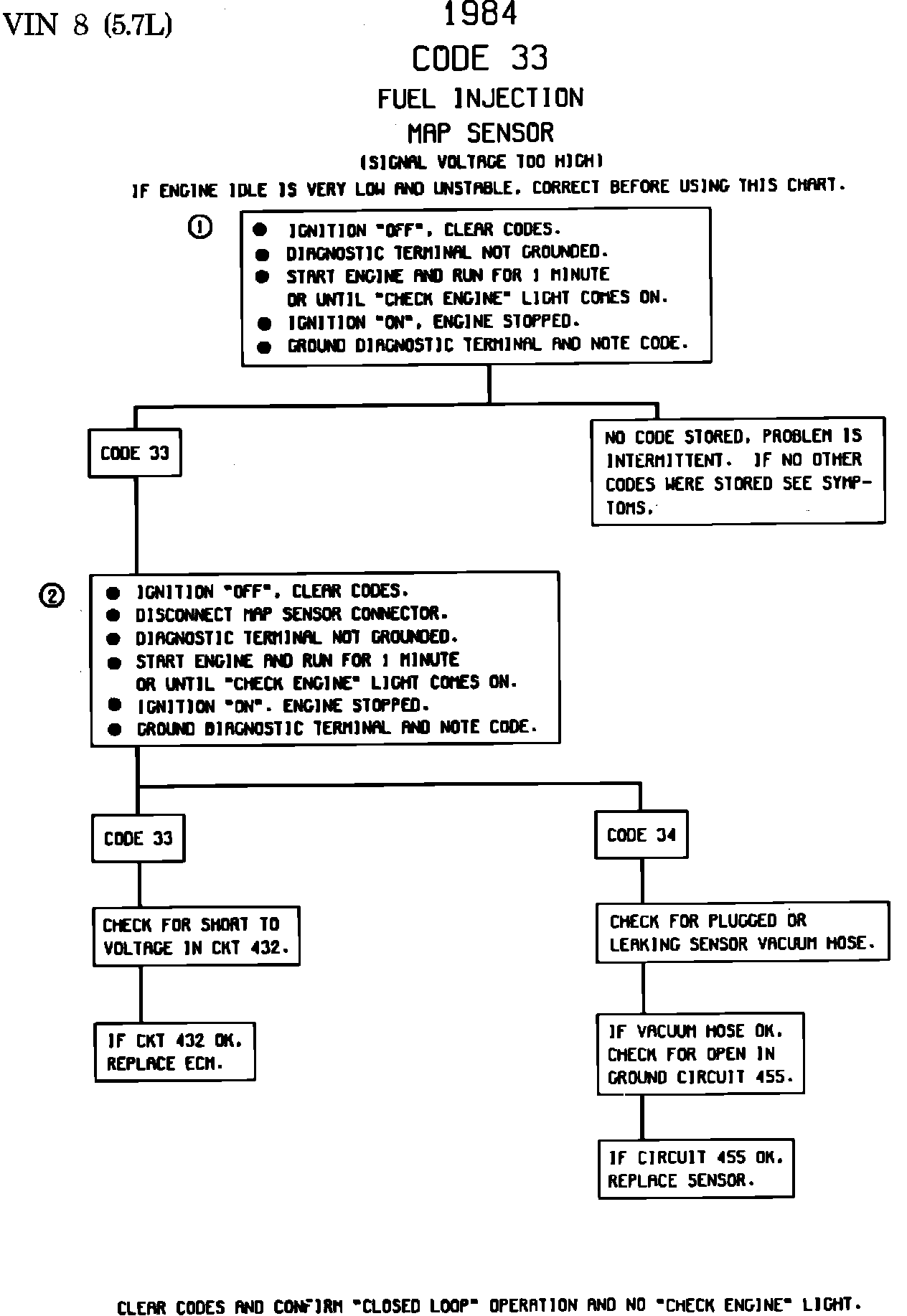 d. A very low and unstable idle may set a Code 33. Correct this condition before using Code 33 Chart.