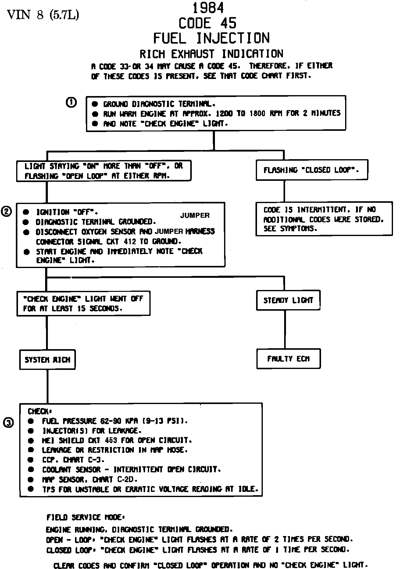 - Fuel Pressure. System will go rich if pressure is too high. The ECM can compensate for some increase. However, if it gets too high a Code 45 will be set. System will then be very rich, with black smoke exhaust.