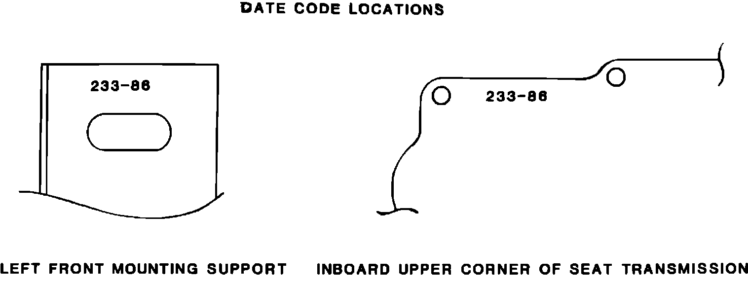 The date code locations are: the left front floor mounting support and the inboard front upper corner of the seat