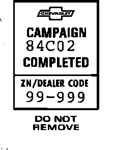 Each vehicle modified in accordance with the instructions outlined in this Product Campaign Bulletin will require a "Campaign Identification Label". Each label provides a space to include the five digit dealer code of the dealer perfoming the campaign service. This information may be inserted with a typewriter or ballpoint pen.
