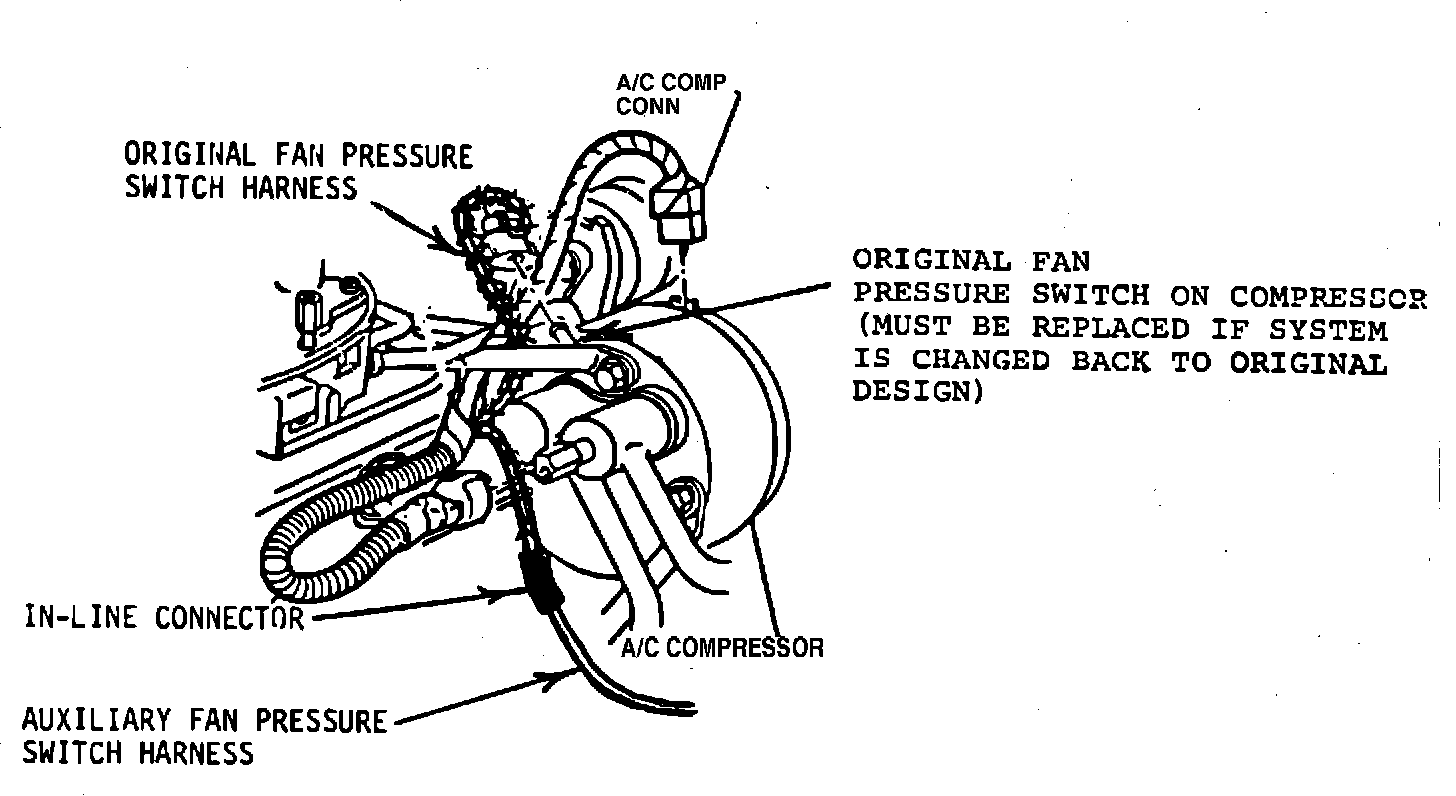 (3) Check the auxiliary fan pressure switch. If replacement is necessary, the vehicle will have to be changed back to the original design. The existing disconnected pressure switch in the compressor will have to be changed according to service manual instructions, including discharging the A/C system.