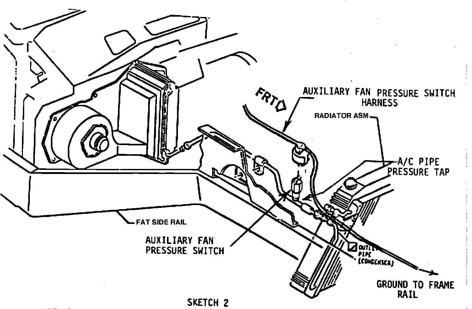 (1) Observe the fan pressure switch on the A/C compressor (Refer to Sketch 1). If the wire harness is connected to the pressure switch, the system has not been revised and this bulletin or following steps do not apply. If the wire harness is not connected to the fan pressure switch on the A/C compressor but is instead connected to an auxiliary jumper harness, proceed to Step 2.