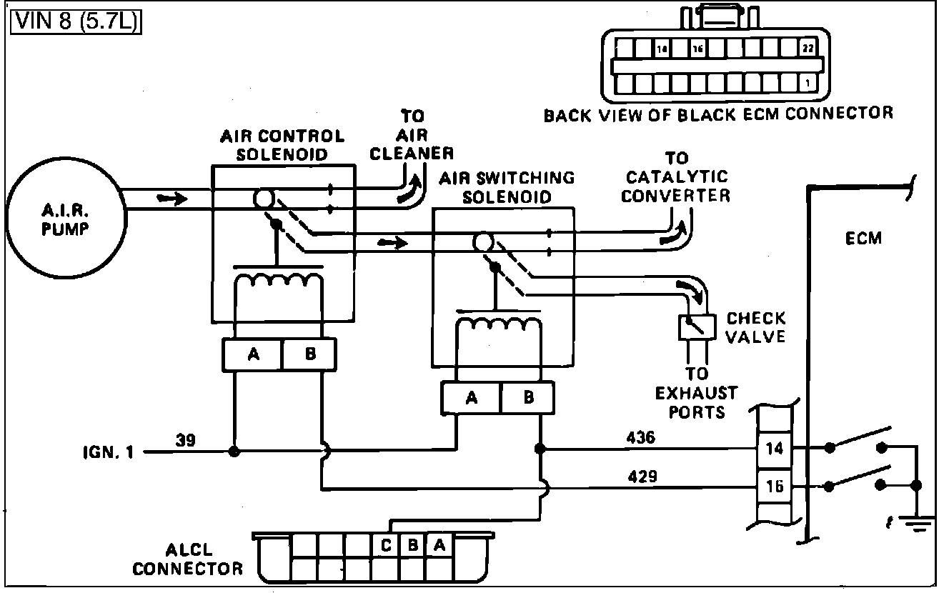 Air Management is controlled by Air Control and Air Switching Valves, each with an ECM controlled vacuum solenoid. When the solenoid is grounded by the ECM, manifold vacuum will activate the valve and allow pump air to be directed as follows:
