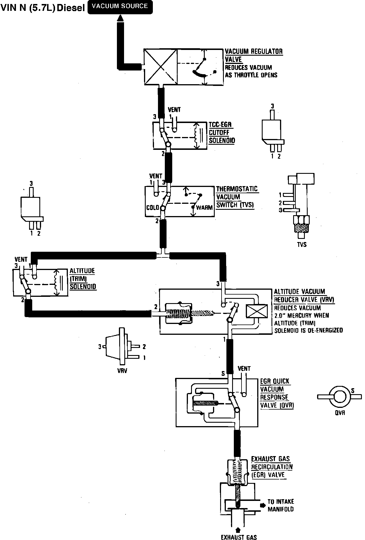 Port 1 of the VRV is connected to port "S" of the Quick Vacuum Response (QVR) valve. When the vacuum applied to port "S" is constant or increasing, the vacuum output to the EGR valve will be the same as the input. When the vacuum input at port "S" drops, the vacuum in the EGR valve is vented through the vent opening of the QVR until the vacuum is the same. The QVR is an equalizing valve that reacts quickly.