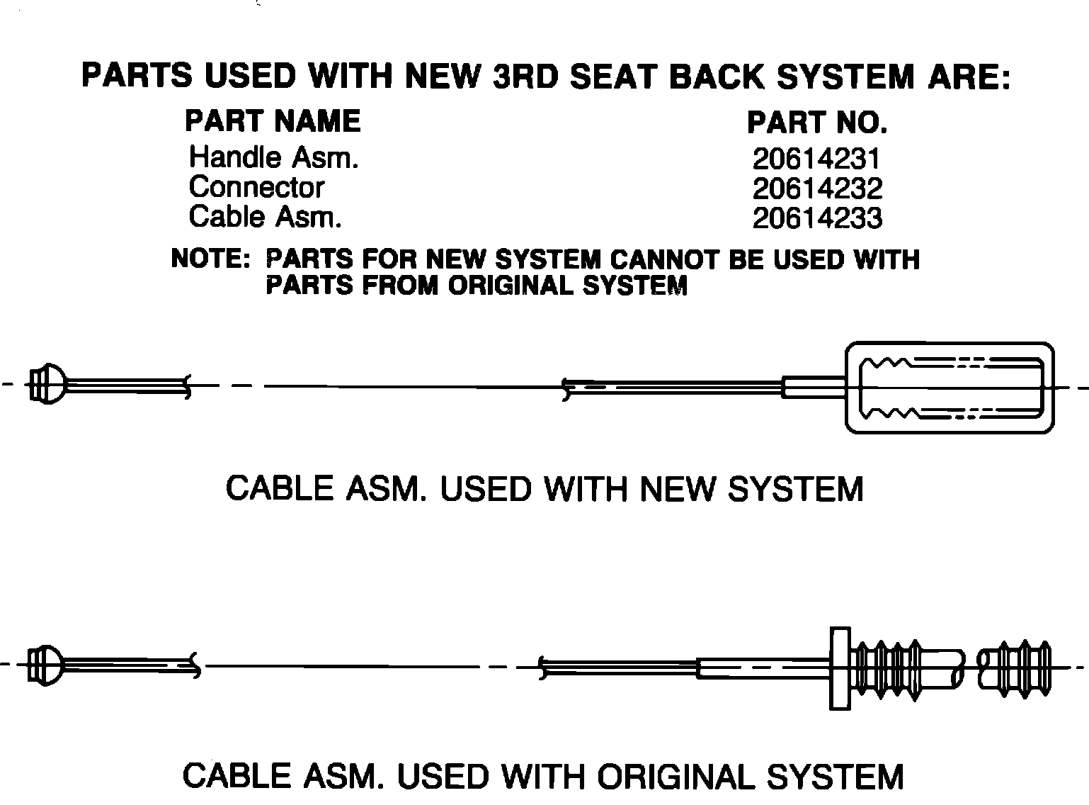 When repairing vehicles with this condition, new improved parts are available from WDDGM. The new parts that make up the seat back release system can not be used with parts from the original system. Therefore, when required, parts from the original system must be completely replaced with new parts. To determine if a system is of the new type, inspect the end of the cable assembly that attaches to the new release handle. A cable that is part of the new system will have an opening that engages the release handle. See illustration.