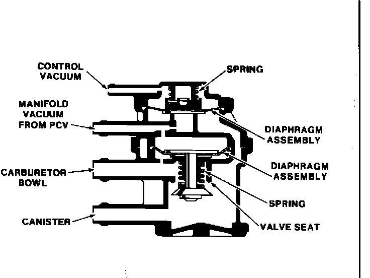 Some four port canister control valves have been replaced as a result of fuel found in the valve or in the carb bowl vent line (refer Figure 1). The presence of fuel found in this area does not necessarily indicate a faulty valve. The function of the valve can easily be checked on the vehicle by following the service procedure outlined below:
