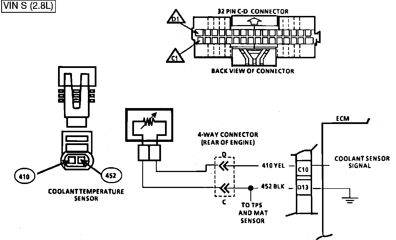 The Coolant Temperature Sensor uses a thermistor to control the signal voltage to the ECM. The ECM applies a voltage on CKT 410 to the sensor. When the engine is cold the sensor (thermistor) resistance is high, therefore the ECM will see a high signal voltage.