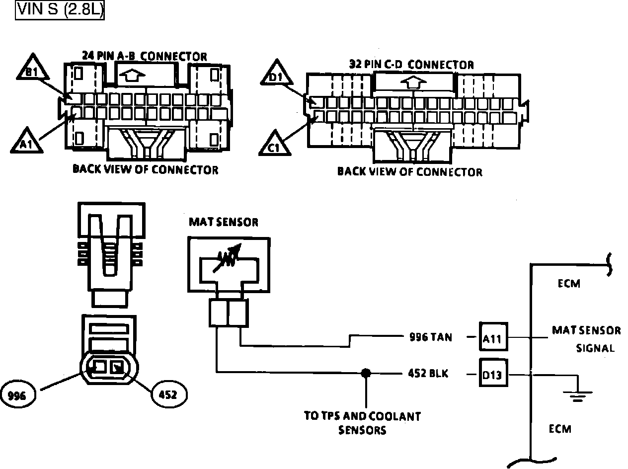 The MAT Sensor uses a thermistor to control the signal voltage to the ECM. The ECM applies a voltage (4-6 volts) on CKT 996 to the sensor. When the air is cold the sensor (thermistor) resistance is high, therefore the ECM will see a high signal voltage. If the air is warm the sensor resistance is low therefore the ECM will see a low voltage.