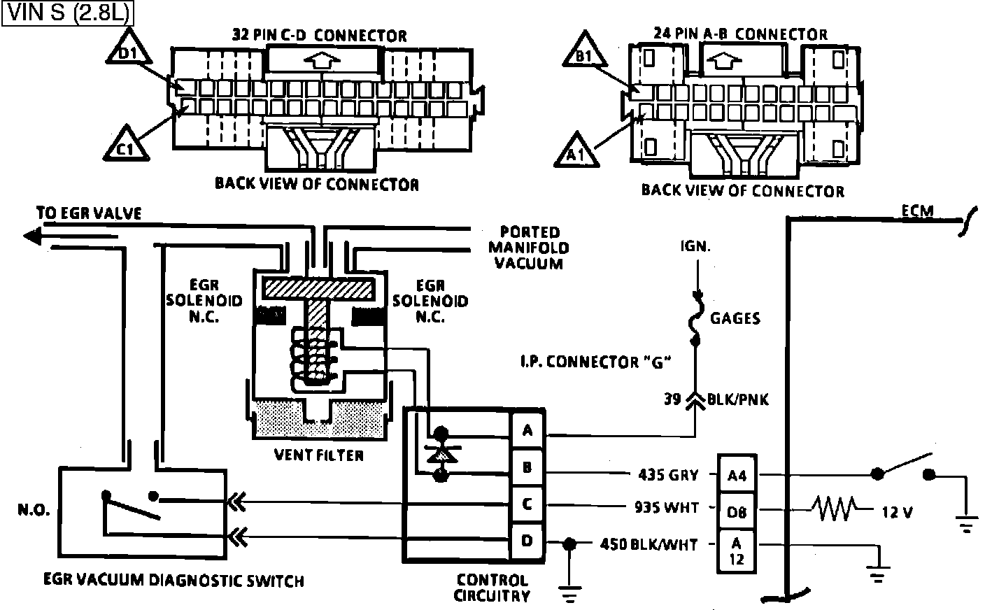 The EGR vacuum control uses an ECM controlled EGR valve. The valve is normally closed and the vacuum source is a ported signal. The ECM will turn the EGR "ON" and "OFF" (Duty Cycle) by grounding CKT 435. The duty cycle is calculated by the ECM based on information from the coolant and mass air flow sensor and engine RPM. The duty cycle should be 0% (no EGR) when in Park or Neutral, TPS input below a specified value or TPS indicating Wide Open Throttle (WOT).