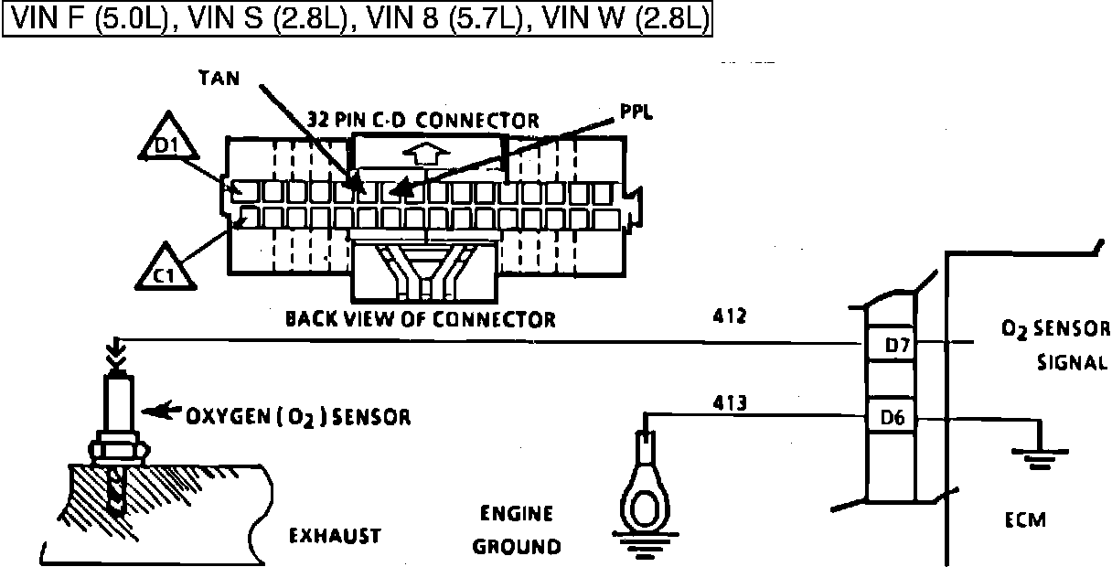 The ECM supplies a voltage of about .45 volt between terminals "D6" and "D7". (If measured with a 10 megohm digital voltmeter, this may read as low as .32 volts) The O2 sensor varies the voltage within a range of about 1 volt if the exhaust is rich, down through about .10 volt if exhaust is lean.