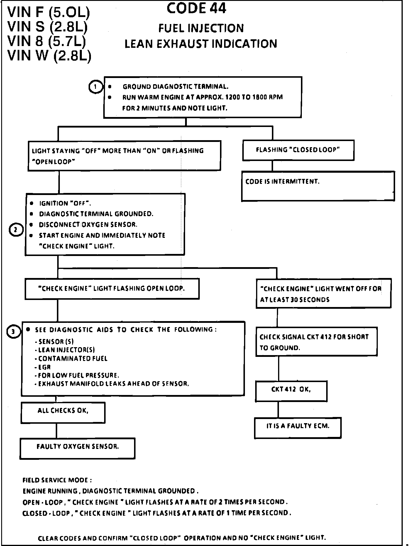 f. Exhaust Leaks. If there is an exhaust leak, the engine can cause outside air to be pulled into the exhaust and past the O sensor. Also check AIR system for AIR being pumped to exhaust 2 ports while in closed loop. See Chart C-6 If the above are OK, and the instructions at the top of the chart will set a Code 44, or "CHECK ENGINE" light is "off" more than "on", or flashing "open loop", it is a faulty oxygen sensor.